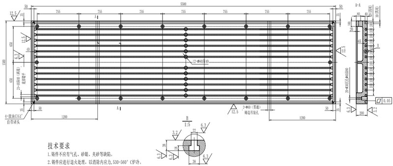 5.7鑄鐵平臺 鑄鐵平臺的作用就是安裝于臺架上的發(fā)動機、測功機及聯(lián)軸節(jié)等部件為一體,確保正確的位置精度。且整體安裝于吸震基礎(chǔ)上,使臺架更加合理。鑄鐵平臺上平面有T形槽。鑄鐵平臺長5500,寬1500,高200mm。