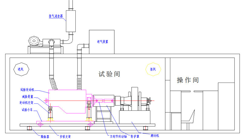 5.8.2箱體結(jié)構(gòu) 箱體結(jié)構(gòu)由箱體框架、內(nèi)外蒙皮板、隔聲門、窗等組成。 箱體四周外表采用集裝箱蒙皮板拼焊,頂部外表采用花紋防滑鋼板拼焊覆蓋,底部在龍骨框架之上采用熱軋鐵板拼焊而成,表面刷防腐防銹涂層,箱體內(nèi)壁進行吸聲降噪裝飾處理。 箱體框架結(jié)構(gòu)采用矩形鋼管組裝焊接結(jié)構(gòu)。在箱體門、窗和通風管處設(shè)框架結(jié)構(gòu),保證具有足夠結(jié)構(gòu)強度,確保在安裝、使用、維護、搬運等過程中不變形。 箱體的結(jié)構(gòu)便于吊裝搬運。箱體頂部布置檢修通道,四周設(shè)置安全護欄,防護欄防銹并漆警戒黃色,設(shè)計符合國家安全要求。 箱體頂面采用5mm的花紋防滑鋼板焊接在頂部的剛結(jié)構(gòu)上,用于承受頂部安裝風機、進排氣系統(tǒng)等輔助設(shè)備的負載。 箱體發(fā)動機試驗間部分安裝試驗臺架及相關(guān)設(shè)備,箱體頂部為輔助設(shè)備層,用于安裝輔助設(shè)備及管路等,箱體內(nèi)設(shè)備布置滿足測功機等整個系統(tǒng)的操作空間。 箱體鋼結(jié)構(gòu)要具有足夠的強度和剛性,在試驗間頂部能放置進排風系統(tǒng)和排煙系統(tǒng)等,試驗間頂部有起吊受力點,能夠承受兩噸的重量,便于設(shè)備修理和維護。